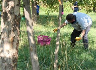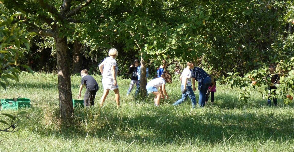 · „Nicht auf die Äpfel treten, also von außen in Richtung Baumstamm sammeln!"