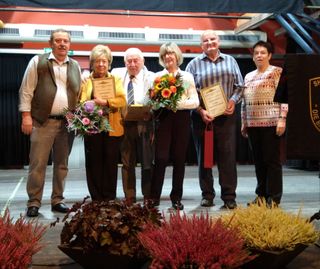 Eingerahmt vom Vorsitzenden und der Schriftführerin Mechthild Klein erhalten Carmen Bothe, Hannsjürgen und Heidi Phieler sowie Veselko Planinic
