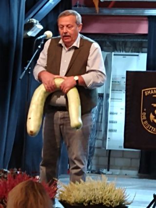 Zur allgemeinen Gaudi zeigte er eine fast 10 kg schwere Kalebasse aus dem eigenen Garten. Wollte die wirklich ein Kürbis werden oder doch eher ein Hufeisen? Die Form hatte sie ja schon. Das abgebildete Exemplar wird nicht zu Suppe verarbeitet, sondern - etwa 1 Jahr getrocknet - ein Rhythmus-instrument.