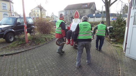 Für den Samstag vor dem 1. Advent hatte er seine Ankunft avisiert. Seit 10 Uhr wartete ein Empfangskomitee auf den weihnachtlichen Gast. Und dann kam er fast pünktlich, standesgemäß im offenen Wagen und huldvoll Grüße der Passanten entgegennehmend. Das jedenfalls versicherte absolut glaubhaft sein Chauffeur Norbert. Überraschung: Der Gast war so vornehm, dass er keinen Schritt selbst tun wollte. Er musste tatsächlich an seinen Platz getragen werden.