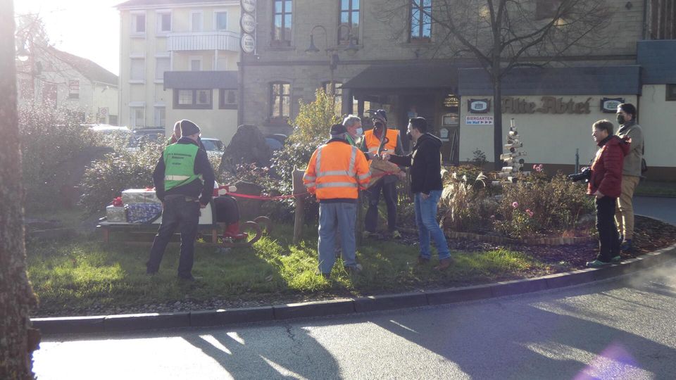 Noch ein, zwei Fragen; ein paar Fotos; die Karawane zog weiter. Nur Jürgen I. blieb zurück. Er wird hoffentlich bis Mitte Januar Autofahrer und Fußgänger grüßen. Die ersten Kinder hat er tatsächlich schon während der Aufbauarbeiten zu freudigen Ausrufen verleitet - für uns der Beweis, dass unser Engagement nicht ganz falsch ist.