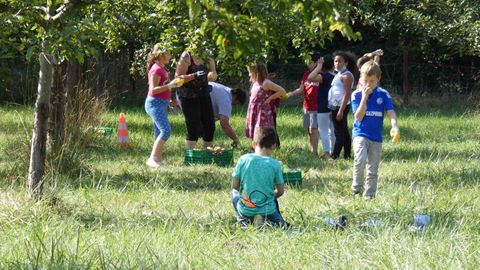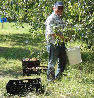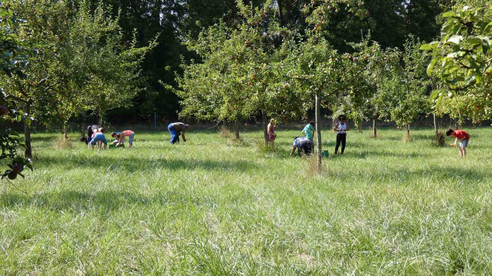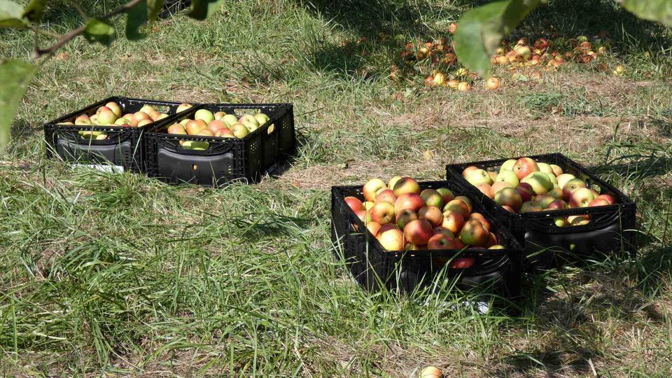 · „Nicht auf die Äpfel treten, also von außen in Richtung Baumstamm sammeln!"