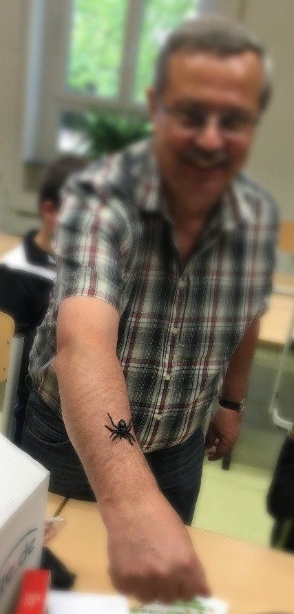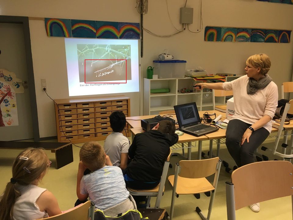 Nach dem theoretischen Teil ging es in den Schulgarten, wo Ernst Kollmann mit den Schülern auf Insektenjagd ging. Dabei sollten die Tiere nur entdeckt, nicht aber gefangen werden; dann erläuterte unser Kollege, um welches Tier es sich handelte, wovon und wie es lebt, ob es stechen kann oder nicht, etc. Besondere Aufmerksamkeit wurde einer toten Hummel zuteil: Da sie nicht wegfliegen konnte, ließ sich ihr Körperbau hautnah studieren. (Aktuell stehen uns leider keine Fotos zur Verfügung!)