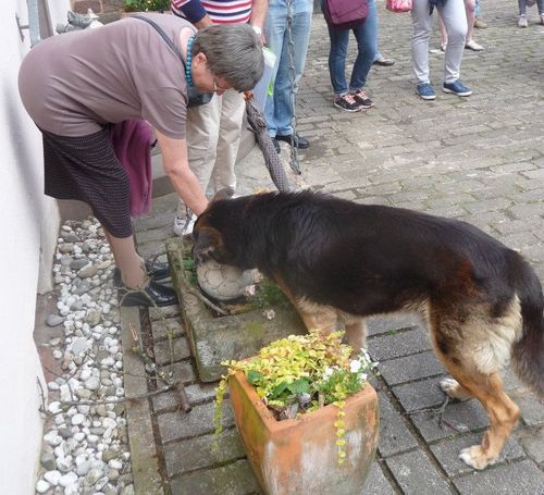 Nicht allzu ernst zu nehmen:Ein einziges Mal erntet Frau Weber Widerspruch: Morgens hatte sich ein Wildschwein in ihren Beritt verirrt. Der schon recht betagte Schäferhund hat es vertrieben. „Zum Glück konnte es durch eine Öffnung flüchten“,